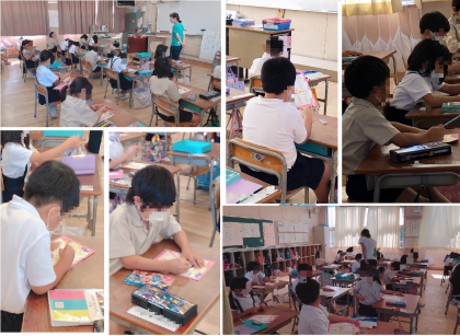 1年生の学活です。自己紹介カードを作成していました。自分の得意なことや好きな食べ物などを紹介し、自分の似顔絵を色鉛筆で丁寧に描いていました。左側が1組、右側が2組の様子です。