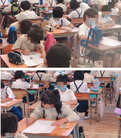 3年生の算数です。テストに取り組んでいました。がんばれ!