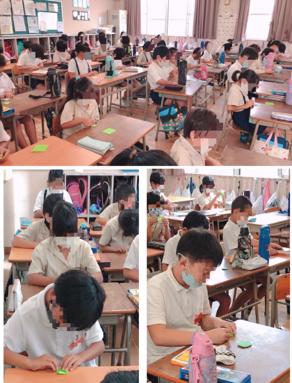 3年生の学活の様子です。玄関壁面を作っていました。色紙でブドウの実を作っていました。いろんな色や形がありました。どんな壁面になるか楽しみですね。
