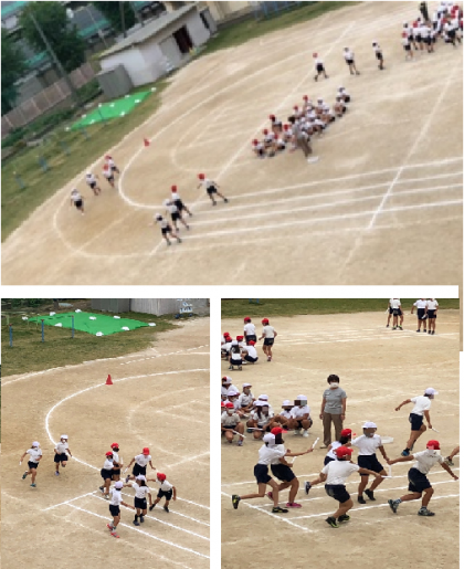 4年生の体育です。リレーの練習をしていました。それぞれが手作りバトンをもち、そのバトン同士でタッチすることでバトンパスに代えていました。