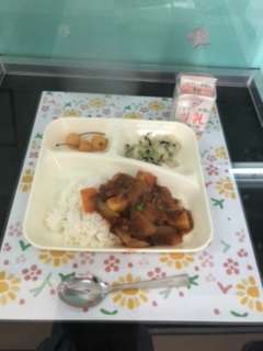 今日の献立は、ハヤシライス(米粉)、キャベツのひじきドレッシング、サクランボ(缶)、牛乳です。ハヤシライスは人気メニューの一つです。しっかり食べて丈夫な体をつくりましょう。いただきます。