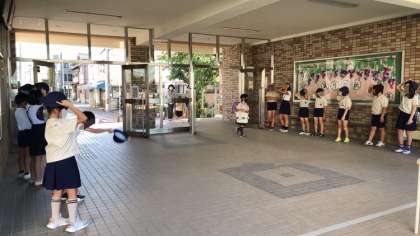 今日から、縦割り班別のあいさつ運動が始まりました。元気にあいさつを交わしています。朝のさわやかな光景です。当番の時はお子さんの登校時刻が早くなると思います。ご協力をお願いいたします。