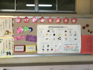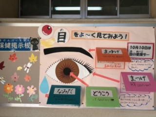 今月の掲示は、保健掲示が10月10日の「眼の愛護デー」にちなんだ眼についての掲示、食育掲示はおやつについてです。わかりやすく工夫された掲示です、子どもたちにしっかり観てほしいです。