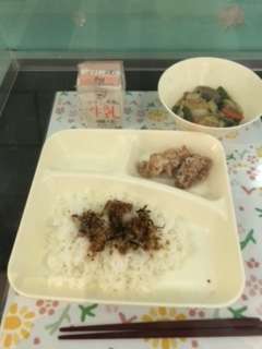 今日の献立は、鶏肉の竜田揚げ、一口がんもと野菜の煮物、おかか菜っ葉、ごはん、牛乳です。竜田揚げも好きな子が多いのではないでしょうか、子どもたちのうれしそうな顔が浮かんできます。いただきます。