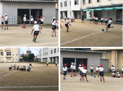 3年生の体育です。キックベースボールをしていました。3年生のルールでは、守備側は、ボールをキャッチしたら塁に投げるのではなくてボールのところに全員が一直線に並びます。攻撃側は、守備側が並ぶまでに通った塁の数だけ得点が入ります。攻撃側にとって誰もが得点できるチャンスが広がること、守備側にとって正確に投げるという難しい技術がいらないので守りやすいことで、中学年児童にとって楽しみやすいゲームになってます。