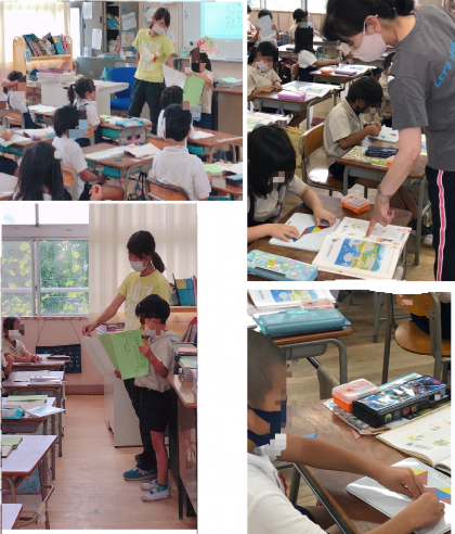 1年生の様子です。右側2つが1組の算数で図形の学習でした。三角形の磁石を使って色々な形をつくっていました。左側2つが2組の国語で「りっちゃんのサラダ」の主人公りっちゃんに書いた手紙を発表していました。