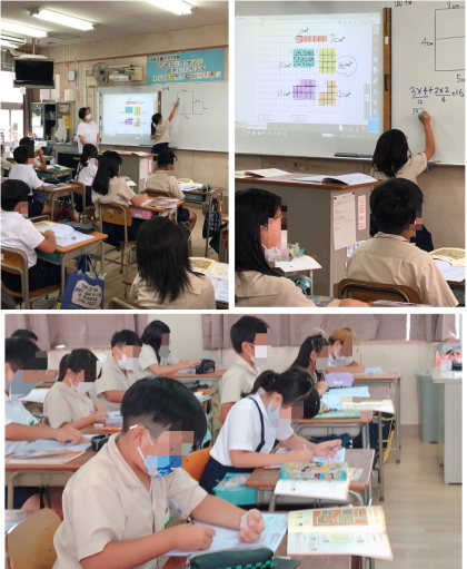 4年生の算数です。複雑な形の面積を求める方法の学習でした。今まで学んだやり方を応用した自分の考え方をみんなの前で発表し、答えが一緒になるかどうか確かめていました。