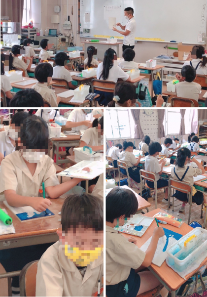 3年生の図工です。「くぎうちゲーム」の土台のデザインに色を塗っていました。「まずは背景から塗って、背景が乾いたら細かい絵部分を塗っていくのがおすすめです。」という先生の話がありました。どの子もとても真剣で、とても静かな中で活動が進んでいました。