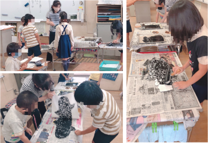1年生の図工です。紙版画の印刷をしていました。先生に手伝ってもらうところもありましたが、うまく印刷ができていました。