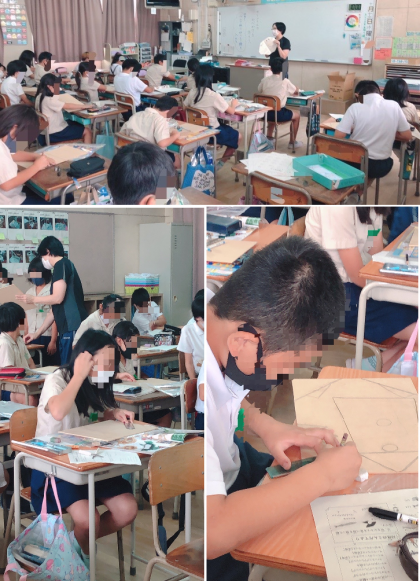 4年生の図工です。オリジナル壁かけを作ります。自分で考えた設計図をもとに、ベニヤ板に切り取り線を入れていきます。