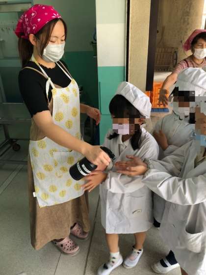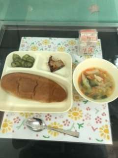 今日の献立は、カツオのマリネ焼き(ノンエッグドドレッシング)、鶏肉とジャガイモのスープ、キュウリのサラダ、黒糖パン、牛乳です。手指消毒をしっかりして気を付けて運びましょう。