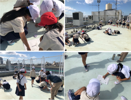 3年生の理科です。太陽の動きの観察で屋上に上がりました。紙の上に建てた棒の影を観ることで太陽の上っている方角や動きなどを調べます。子どもたちは、日ごろは屋上には行けないので少しテンションが上がっている様子でしたが、観察はしっかりしていました。