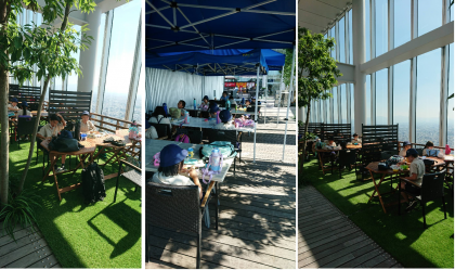 昼食の時間です。テラス席を用意していただき、いい眺めの中でお弁当をいただいています。子どもたちは行儀よく黙食していますとのことです。
