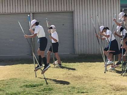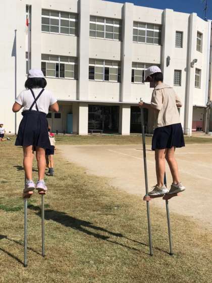 お昼休みに竹馬の練習をしている子たちがいました。中にはけっこう高い竹馬を上手に乗りこなしている子たちもいました。