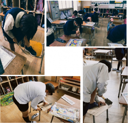 4年生の図工です。オリジナル壁かけの制作です。初めて使うのこぎりで1枚の板から部品を切り出していました。「先生、切れた」ってうれしそうな声をたくさん聞きました。