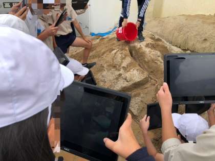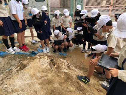 5年生の理科です。流れる水のはたらきの学習です。運動場の盛り土のところで実際に水を流してみて土の削れ具合を調べています。タブレットで撮影して、教室でじっくり考察します。