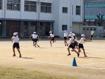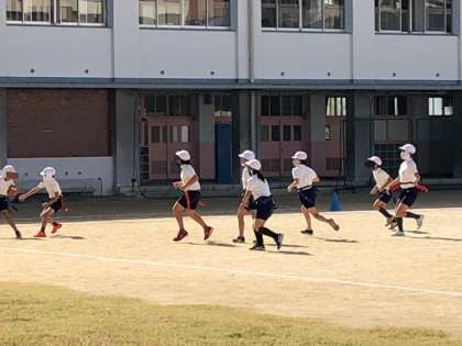5年生の体育です。タグラグビーのゲームをしていました。白熱していました。