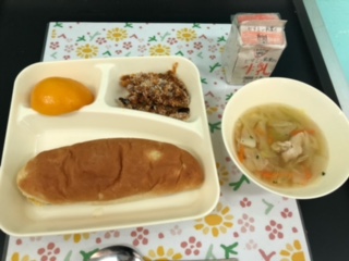 今日の献立は、なすのミートグラタン、鶏肉と野菜のスープ、黄桃(缶)、おさつパン、牛乳です。いただきます。