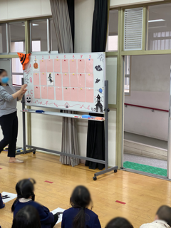カボチャやお化け屋敷、コウモリなど、楽しい絵がたくさんあり、ゲームを楽しみながら、英語での言い方も一緒に学んでいました。