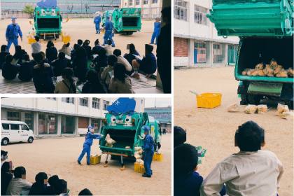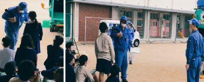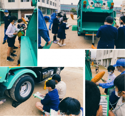 4年生の社会です。環境事業局の方々に来ていただいて、パッカー車やごみ問題などについての学習をしました。パッカー車がごみを収納する様子を見たり、パッカー車についてのクイズ(ヒントがパッカー車の周りに貼ってあります)に挑戦したり、質問コーナーで質問したりしました。いろんなことを丁寧に教えていただき、とても勉強になりました。環境事業局の皆さん、ありがとうございました。