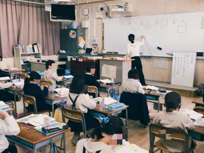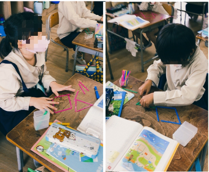 1年生の算数で形の学習です。数え棒を使って四角や三角をつくり、それらを組み合わせて家の形や魚の形などをつくっていました。