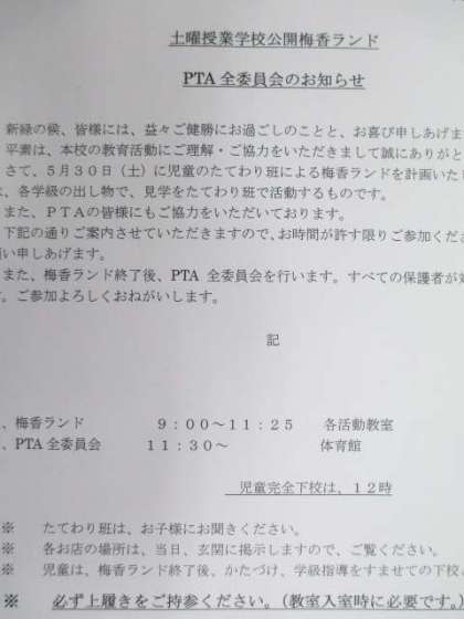 また、本日5月30日に予定しております、梅香ランドおよびPTA全委員会のお手紙を配布しております。ご確認ください。