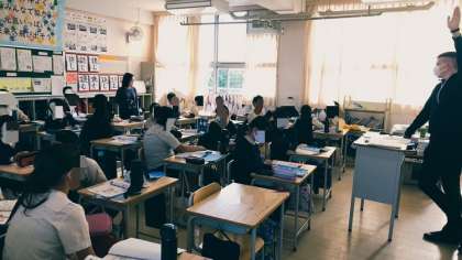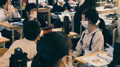 5年生の英語です。形容詞について学習しました。グループでの話し合いも取り入れながら進めていました。