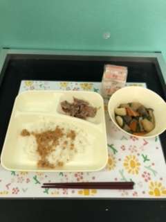 今日の献立は、豚肉のネギ醤油焼き、ふきよせ煮、ツナ大豆そぼろ、ごはん、牛乳でした。残さずおいしくいただきました。