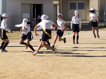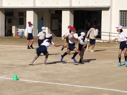 6年生の体育です。タグラグビーのゲームをしていました。観ていてとても迫力があります。