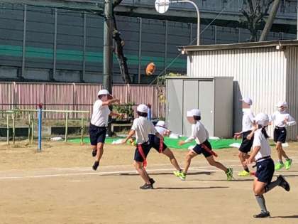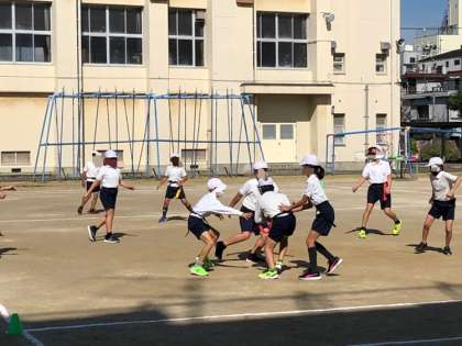 5年生の体育です。タグラグビーのゲームをしていました。5年生も6年生に負けず劣らず迫力のあるゲーム展開でした。