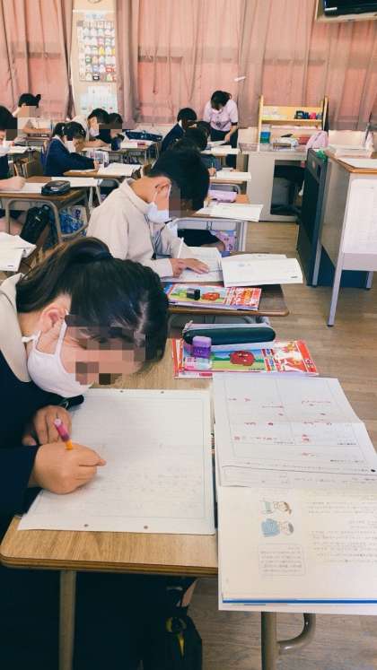 4年生の国語です。「聞いてほしい 心に残っている出来事」の単元で学習したことをもとに自分が聞いてほしい出来事をプリントにまとめ、それを文章に直して発表原稿を作っていました。