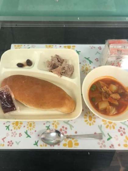 今日の献立は、豚肉のガーリック焼き、ケチャップ煮、うずら豆のグラッセ、コッペパン、いちごジャム、牛乳です。いただきます♪