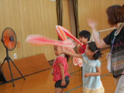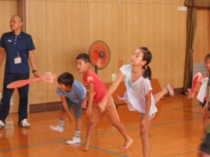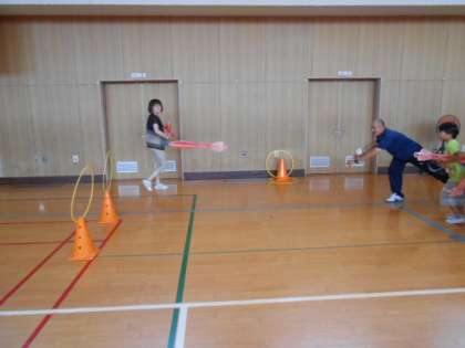 やわらかいロケット型の用具を投げ、その距離を測定します。