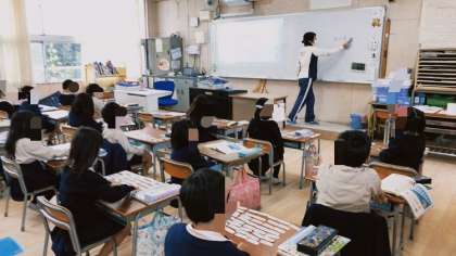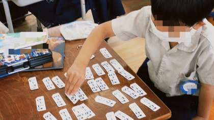 1年生の算数です。たし算カードの中から先生が言う数字が答えになる式を見つけます。「答えが13になる式はどれかな?」、先生の質問と同時くらいに一斉に探し始めていました。