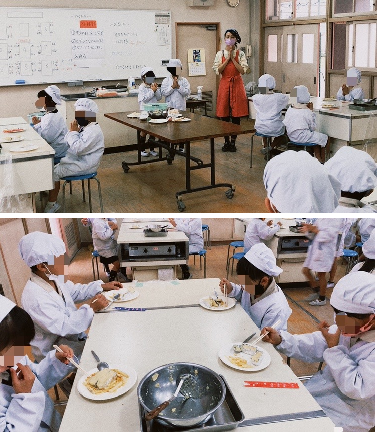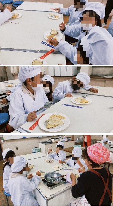 出来上がったスイートポテトと大学芋は、きれいに手を洗った後、みんなで黙食しました。校長もいただきました、とてもおいしかったです。