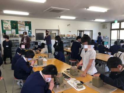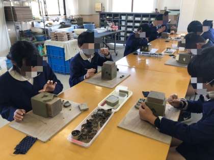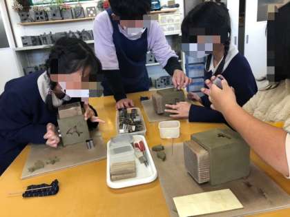 6年生一行は、瓦粘土陶芸体験の最中です。淡路島伝統的地場産業の淡路瓦に使用する粘土を使った作品を作っています。