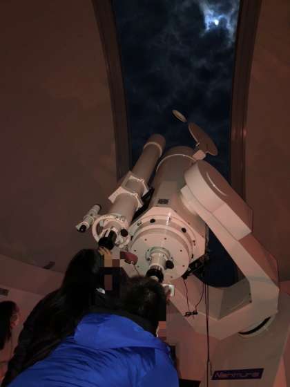 今日最後のプログラム、スターウォッチングです。あいにくの曇り空でしたが、雲の切れ間から月が見えました。クレーターまで見えました!