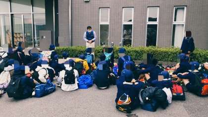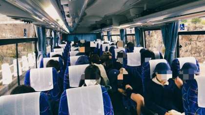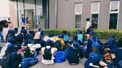 閉舍式で南淡路休暇村の方にお礼を言ってバスに乗りました。今日最初の活動場所、亀浦観光港に向かいます。