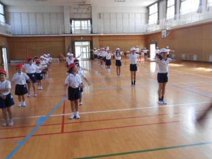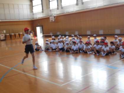 1年生は20メートルシャトルランがどのようなものかわからないので、6年生のお兄ちゃんが見本を見せてくれました。