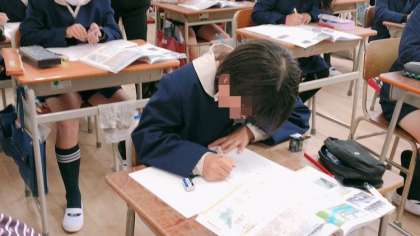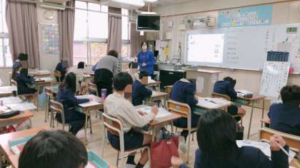 4年生の社会科です。大阪府の学習で淀川について調べています。白板に書かれたキーワードについて教科書等で調べ、ノートのまとめていました。