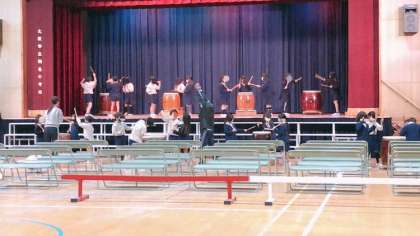 2年生が学習発表会の練習をしていました。和太鼓の重層な音がリズムよく響いていました。