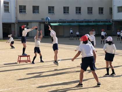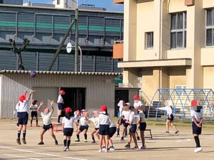 4年生の体育です。1,2組合同でポートボールのゲームをしていました。日が照っているところは暖かくなってきましたが、風は冷たいです。子どもたちは、頬を赤くしながら頑張っていました。