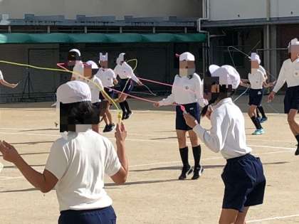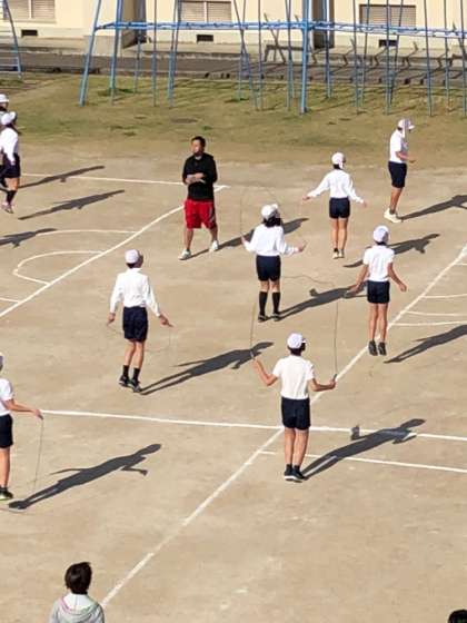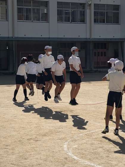 6年生の体育です。縄跳びを頑張っていました。前跳びや後ろ跳び、長縄にも挑戦していました。