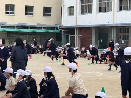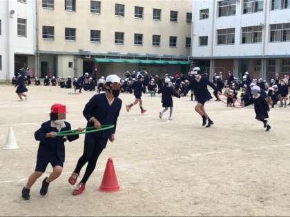 今日の児童集会は、縦割り班対抗のフラフープリレーでした。低学年と高学年が組んで走ります。がんばれ!がんばれ!
