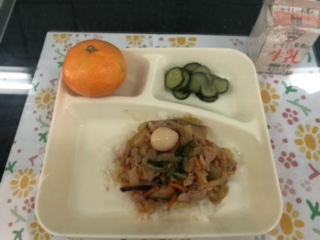 今日の献立は、中華丼、キュウリの中華和え、みかん、牛乳です。いただきます。