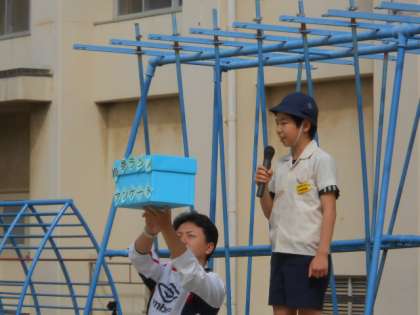 6年生の子どもが全校児童の前で立派にお話しました。