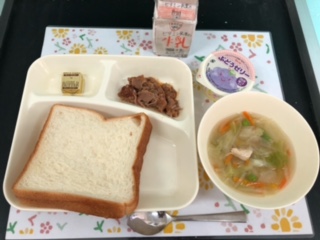 今日の献立は、豚肉のデミグラスソース、スープ、食パン、ブドウゼリー、牛乳、バターです。いただきます。
