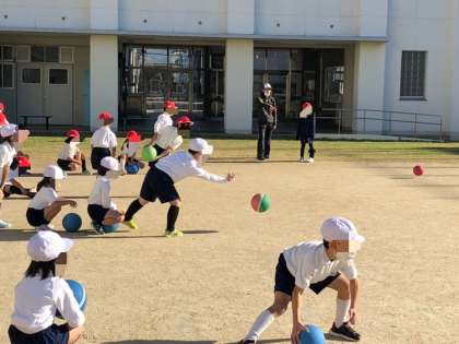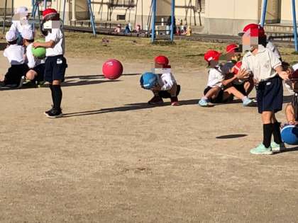 1年生の体育です。ボールを使ったあそびの学習で、「転がしドッジボール」をします。ボールを自分の思ったところに勢いよく転がすことができるよう練習していました。