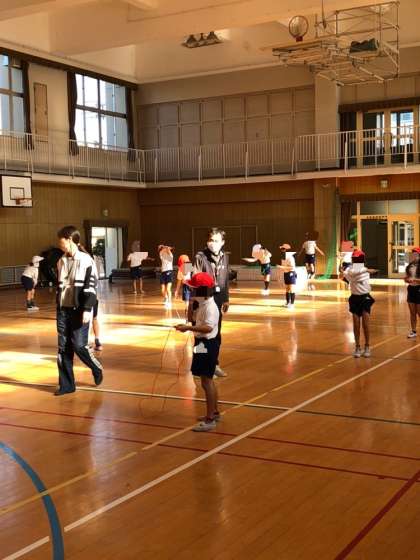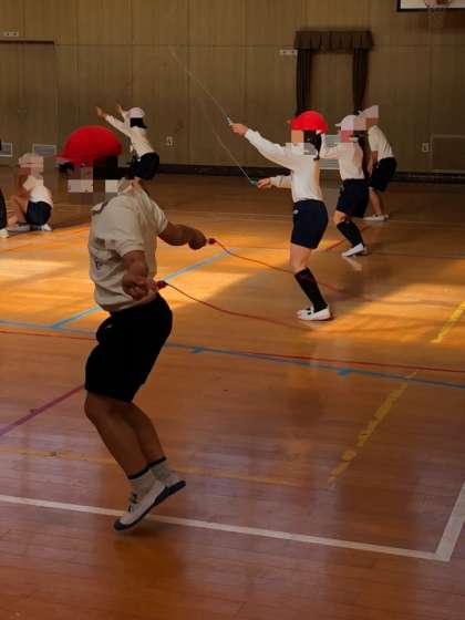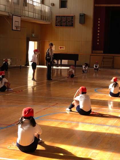 2年生の体育です。縄跳びの学習で、「あや跳び」に挑戦していました。上手な子の試技を観ることは上達への近道です。試技を観て上手に跳べるコツはどこなのかをみんなで見つけます。