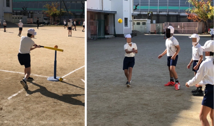 5年生の体育です。ティーボールのゲームです。攻撃も守備もずいぶん上達しました。みんな楽しそうでした。
